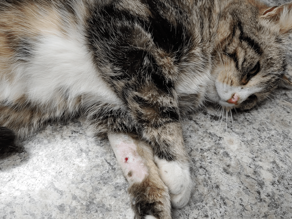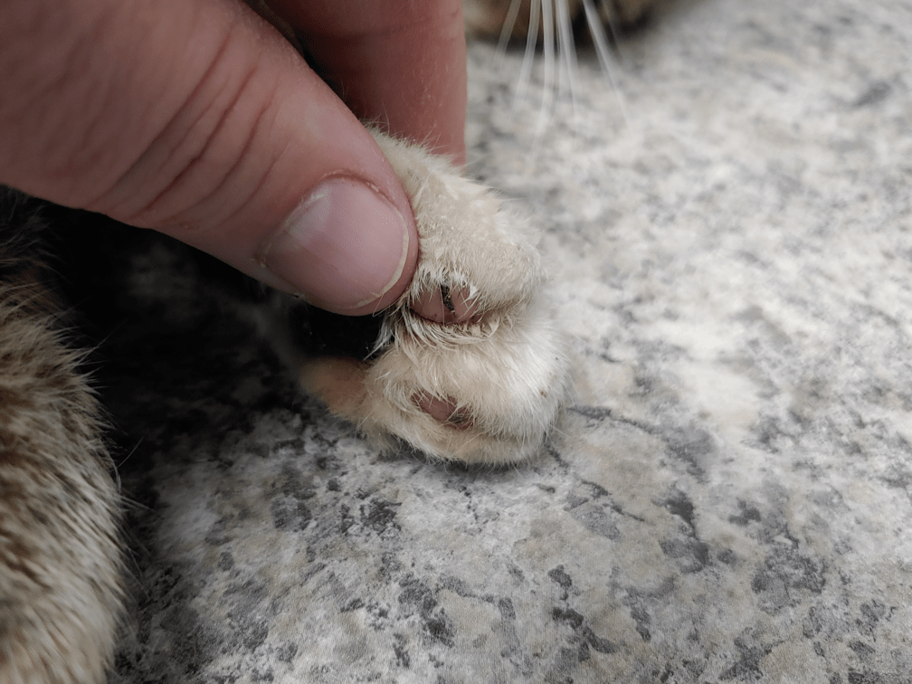 This was on his other paw, and probably causing him pain, too. She was thinking he probably had a hard time deciding with leg to limp with! It’s an older wound, though, and scabbed over, so she didn’t want to poke at it too much.
