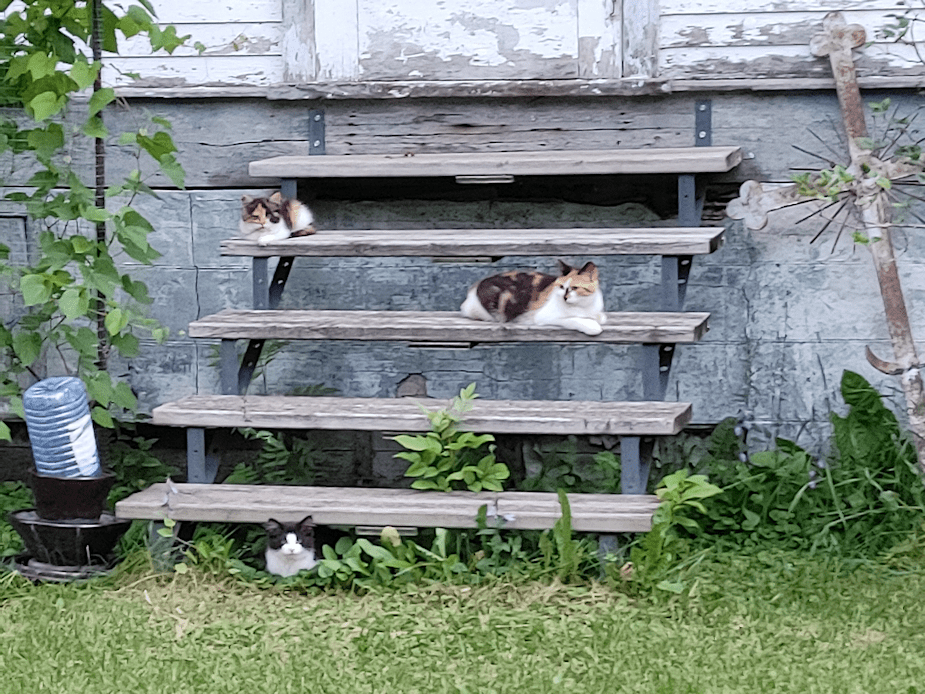 The cats are much more laid back out the food and take their time coming out, even though the kibble trays were empty. Clearly, they are no longer as hungry as they were when it was still cold out. I only saw 8 cats in total this morning, which means we are “missing” about 10 cats. I know some, like Potato Beetle and Broccoli, will come by later, but others have not been seen in weeks.