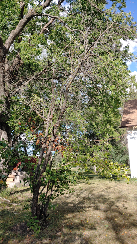 The plum in the background does have a lot of dead branches, but at the top, it’s still alive. I am leaving it for now.