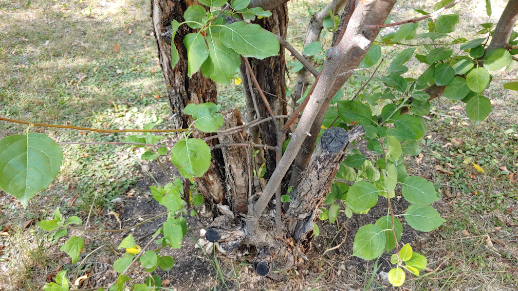 I had already cut the dead parts of the main tree, our first summer here. What was left were the suckers growing out the base. As the main part was grafted, what grew out the base was not the same type of apple as what had already died.