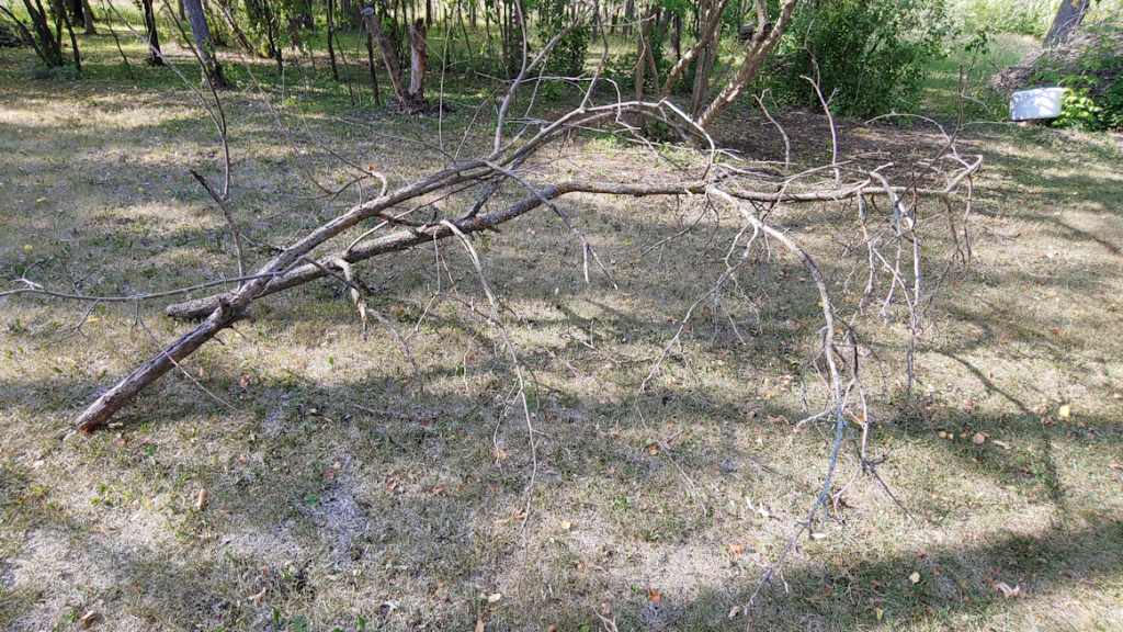 I haven’t done much beyond maintaining what I did in this area last year, trying to focus on the East yard and the spruce grove, instead. Even so, I can see how the trees that seemed the weakest last year are either struggling even more this year, or have died outright. The row of apple trees to the north of the spruce grove is no exception. I don’t think we’ll be getting many apples this year. Not just in quantity, but they bloomed so late, it’s unlikely they’ll have time to ripen before the cold sets in. One that had been pruned back the summer before we arrived had started to recover fairly well, but not enough to survive this past winter. Others in that row have lost quite a few branches. Those, I think I’ll leave pruning back until next spring or so.