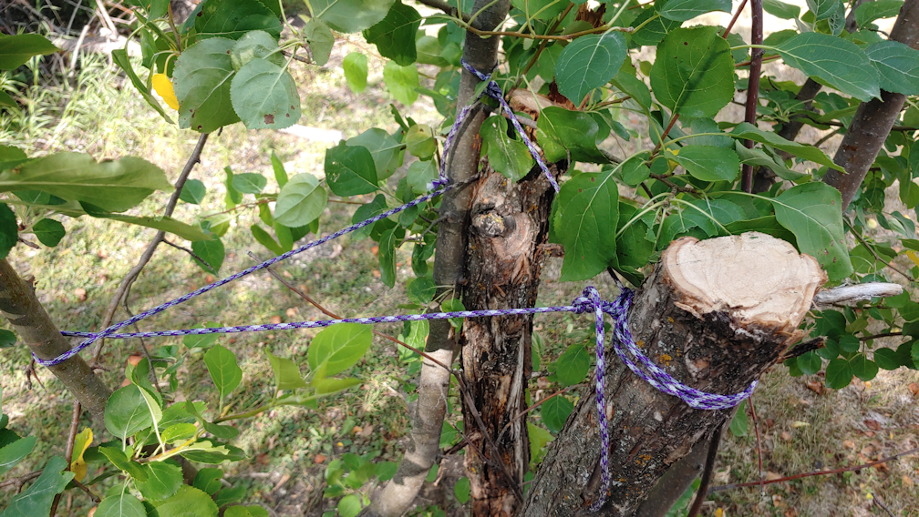 I took the branch that was hanging down the most and braced it against one of the remaining trunks. It had a secondary branch that immediately began leaning over in the other direction, so I used rope and the remaining trunk pieces to support them. If they survive, with this support, they will continue to grow stronger, upwards.