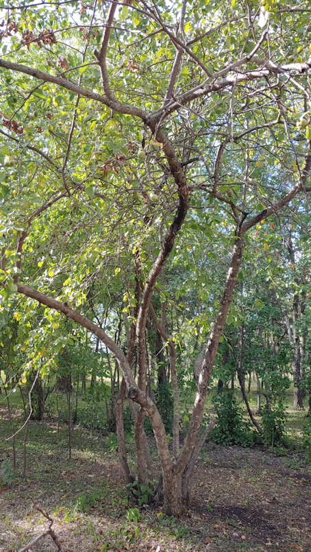 There are two large branches on the apple tree that have died. In the background, you can see the dark coloured plum tree meandering its way up. The branches are so tangled, it was hard to see what belonged were, but it seemed that the plum branch still had live branches and little plums at the top.