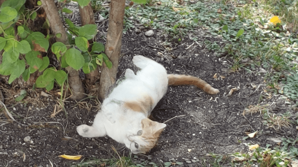The base of this tree is one of the cats’ favorite rolling-in-the-dirt places. When I first spotted them, though, he was mostly hidden behind the tree. It was his Aunty Beep Beep that had me laughing. It looked like a pair of eyes was watching me from the ground!