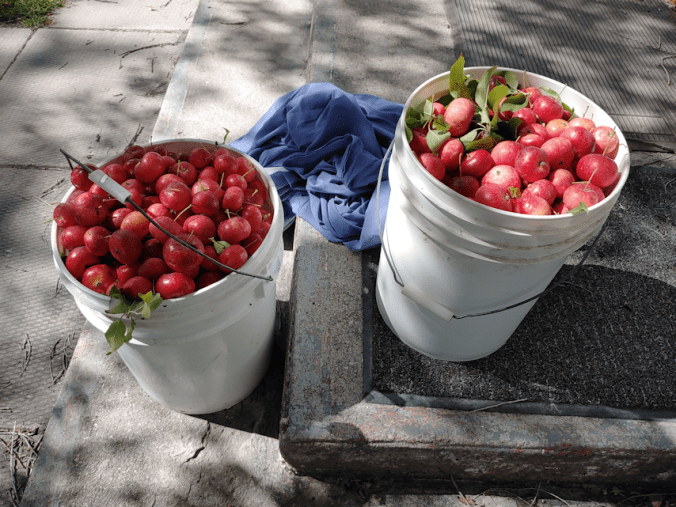 The one tree that was giving larger, sweeter apples this year resulted in about 2 1/2 gallon buckets of apples.