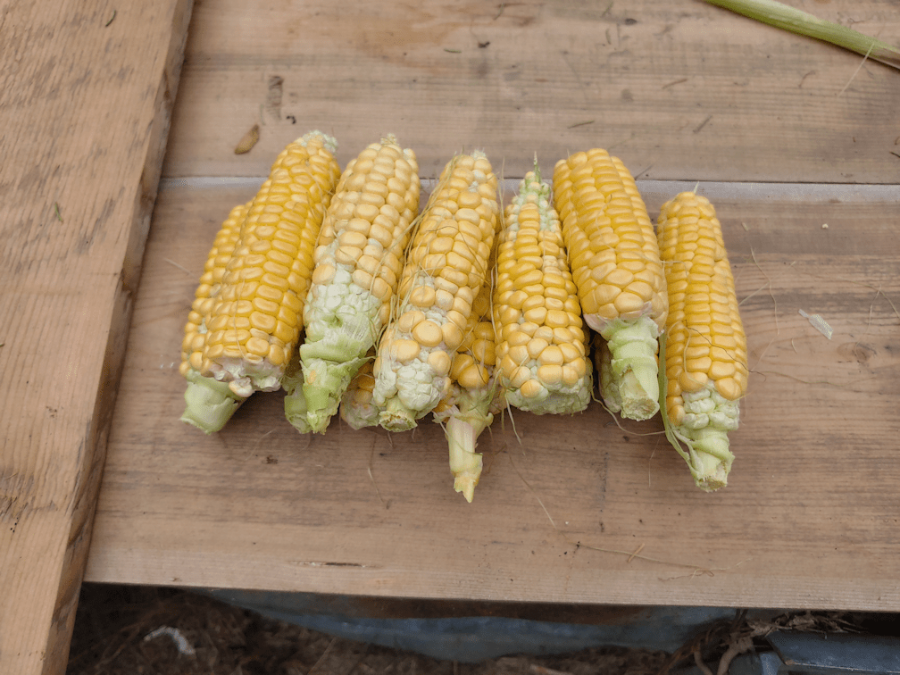 On checking the cobs, you can see that a couple of them were almost completely ripe, if poorly pollinated. When ripe, the kernels should be an even darker purple.
