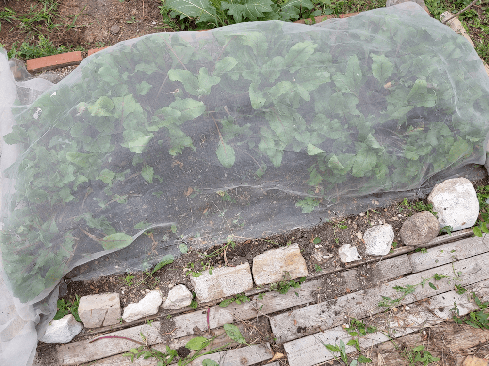 One of the things we’ve done to protect some of our garden beds from the groundhogs and deer was to use mosquito netting as row covers. The edges were weighed down with whatever was handy; rocks, bricks, pieces of wood… that sort of thing.