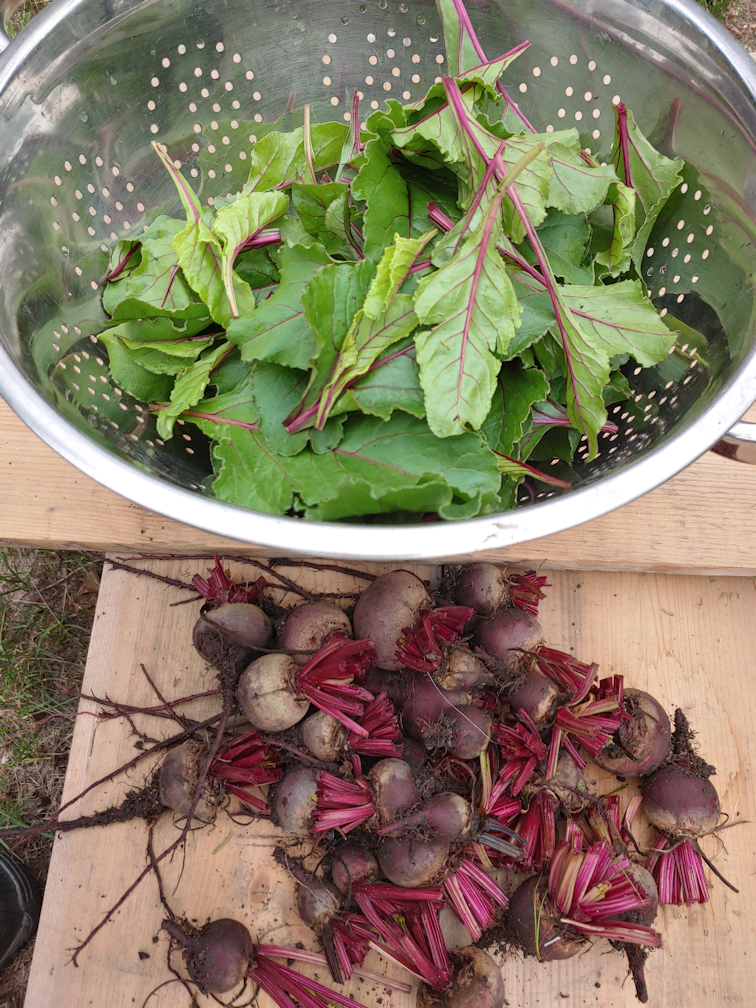 I picked the beets that had the most of their greens eaten, plus a few more while I was weeding, which left me with some greens to harvest as well.