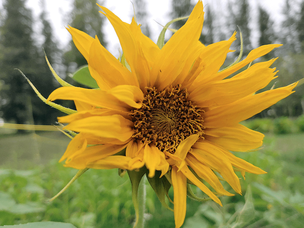 This morning, we are finally seeing yellow petals on the sunflowers! Most don’t even have heads developing yet. The Mongolian Giants are the only ones with developing heads right now. Given we’re in the second half of August right now, I don’t know that we have enough season left for them to develop. The sunflowers in the fields we pass are not only in full bloom, but today I drove by a field where the seed heads are already past blooming and starting to dry up.