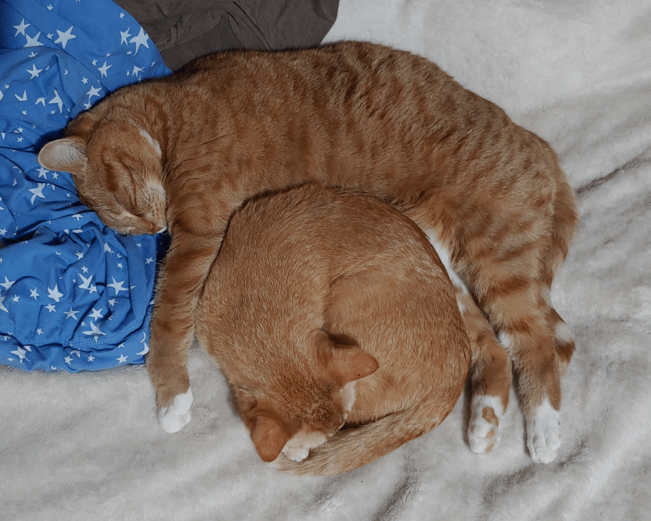 Cheddar always steals my butt spot. Turmeric joined him. They are such a matched set! Cheddar is about 3 times her weight, though. 😁. Turmeric is such a tiny thing, and Cheddar is a burly beast.