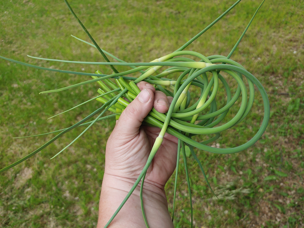 Before coming in from my rounds, I paused to get eaten alive by mosquitoes while picking the rest of the garlic scapes in the main garden. There are only a couple that weren’t ready to pick. Looking forward to using them!