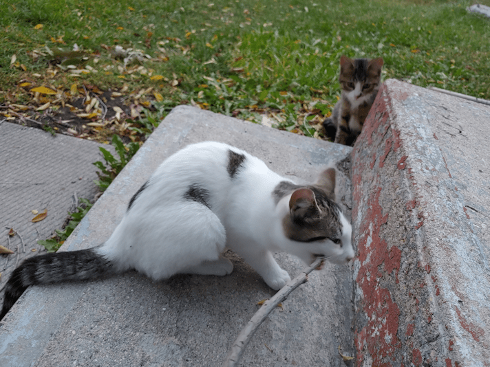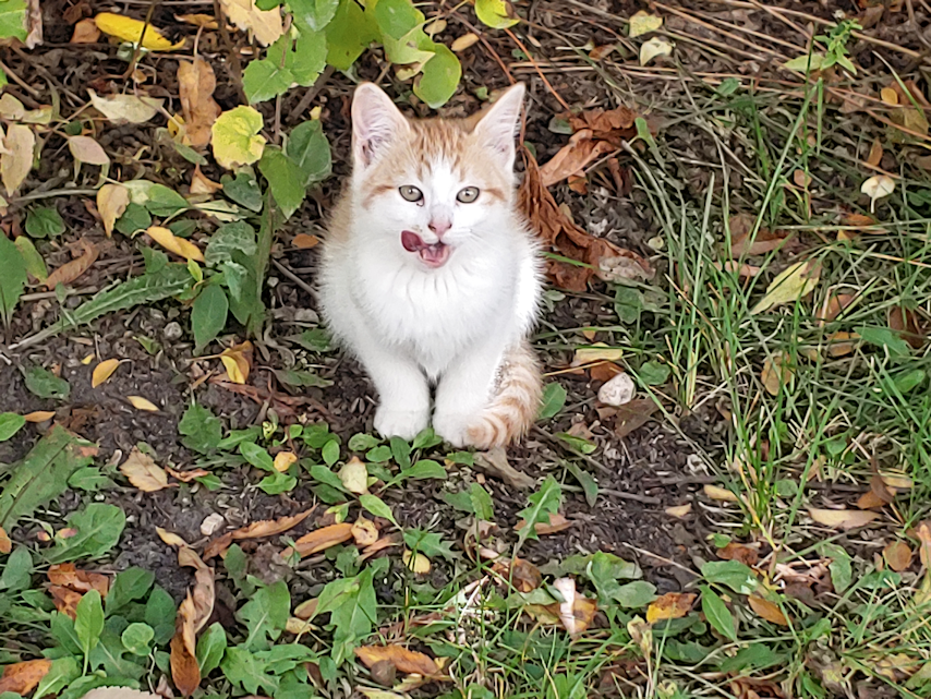 I think I have spotted another older kitten around. I’ve seen it at least twice, and had mistaken it for Junk Pile cat, but it has more white, and looks to be about the same age as her kittens. I have no idea where it is coming from, or which mama cat it is with! Perhaps one of Rosencrantz’s kittens? I thought she had three, but I just went back through my old photos, and I only ever captured two in the pictures; an orange one that we haven’t seen since, and the white one with grey and orange spots that I sometimes see.