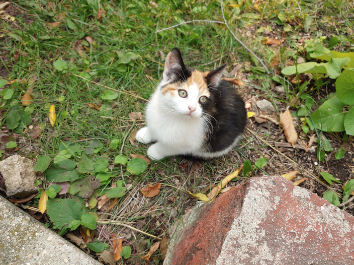 While I was working in the yard during the day, I saw Butterscotch, but not her kittens. So it was a lovely surprise when I was doing my rounds in the evening, and saw what turned out to be the little calico.