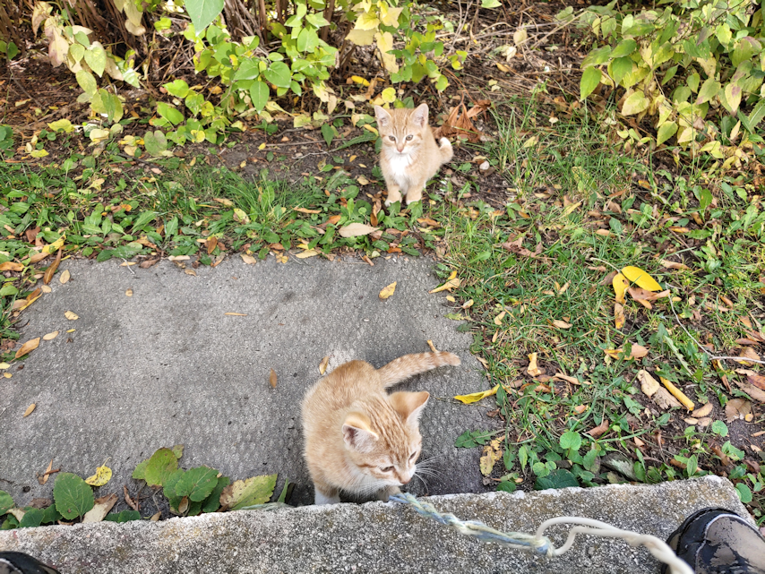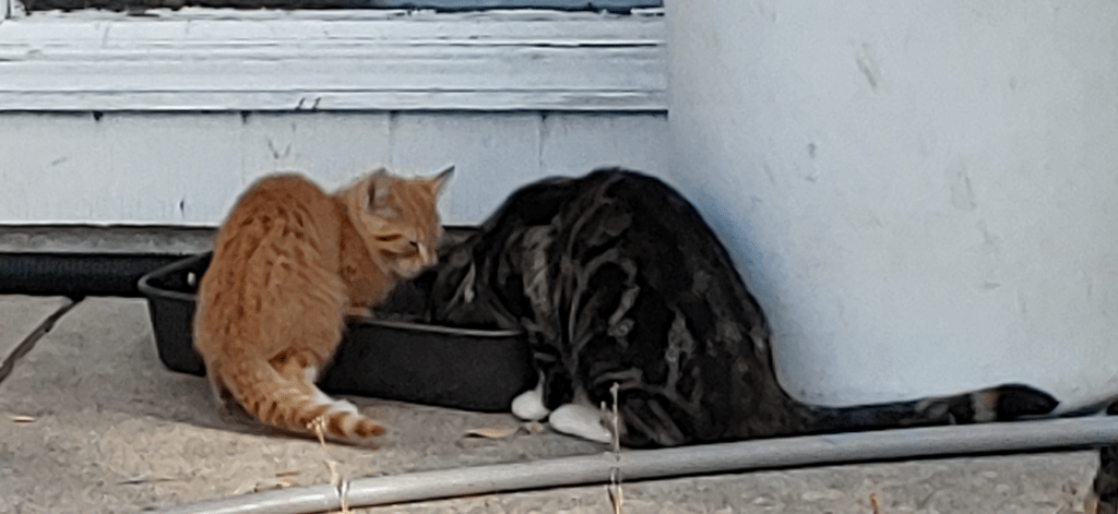 Two of Junk Pile cat’s kittens were running around while I was out. Little Braveheart was following Creamsicle around. He seems to get along with them very well! I topped up the kibble bowls, and while he was eating, Little Braveheart came over and booped her head against his before starting to eat, herself. :-) So cute!