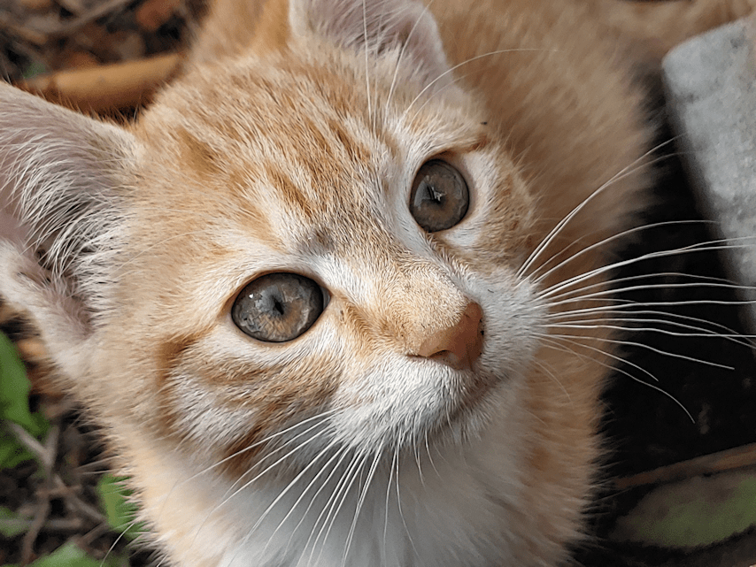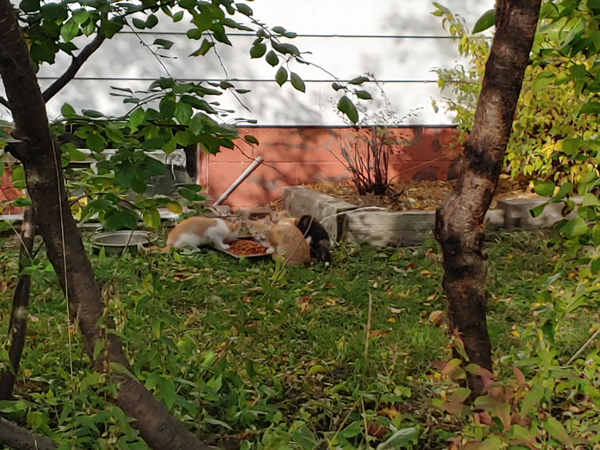 Unfortunately, I startled her away, but this is the first time I’ve seen the little kittens on that side of the house. Of course, I had to go and check, making sure to quietly go around the other side, and sure enough, Butterscotch had finally brought her kittens to the food and water bowls by the sun room!