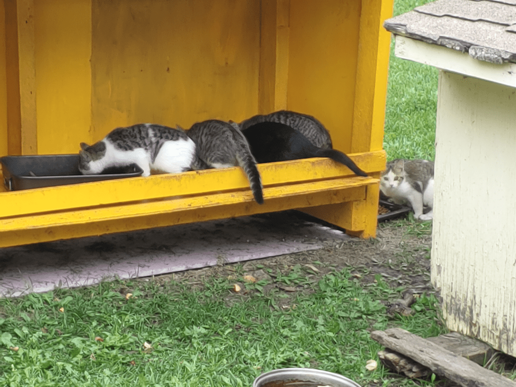 There are actually six kittens in this photo. There’s the four in the kibble house, Junk Pile Jr at the other kibble tray outside the kibble out, and there’s a grey tabby behind her. You can just barely see the top of it’s back.