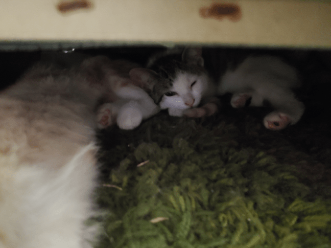 Unfortunately, Rosencrantz was in there, too, and she does not like Junk Pile’s babies. Any time one of the kittens went in there, I could hear her growling at them.