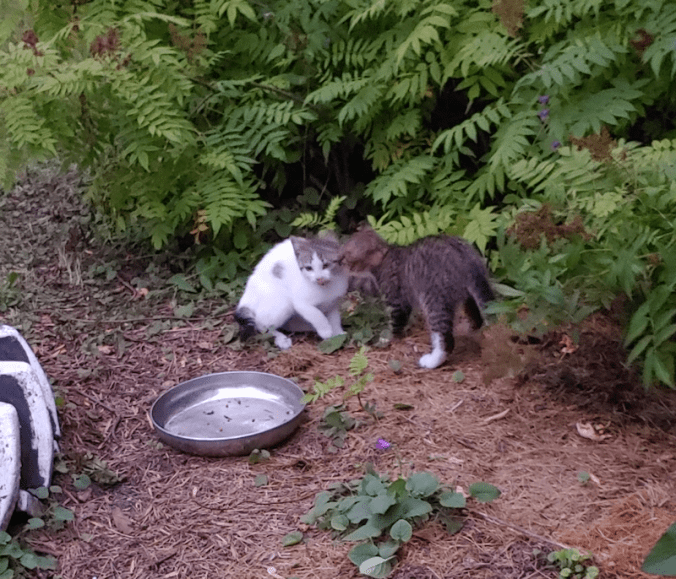 The food bowl I’ve put there for them was empty, but the ones by the house still had kibble in them, so I didn’t add more. I wanted to encourage them to go to the house.