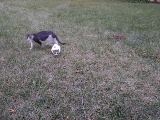 Instead, I went into the sun room and dug up a baggie with a few cat toys in it, tossing some outside for the babies. Potato Beetle was with me again, and he went running after the toys, too. I was pleased to see that he and the kittens would sometimes play with the same toy together, with no animosity between them!