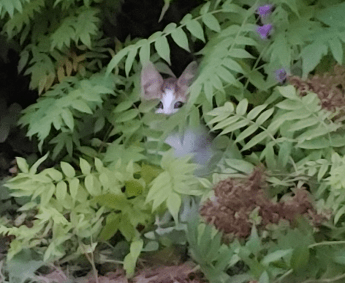 Little Braveheart and her tabby sibling were willing to come out and play nearby. More Braveheart than Tabby, who often ran back into the spirea.