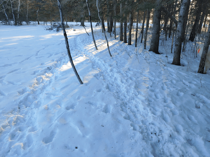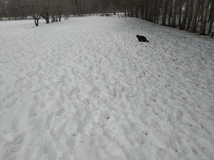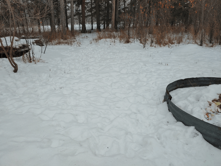 I was in the path I mow to the back gate, half way between the fences for the inner and outer yards. The line of snow is what was hard packed from so many hooves, it left their mark in snow that’s taking longer to melt away.