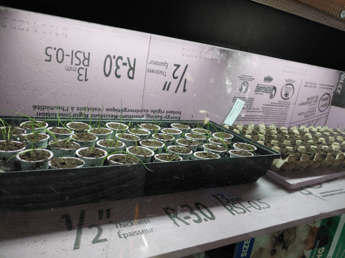 I really hope the temperatures warm up overnight and stay warm, soon. When we start having to get larger numbers of seeds started, they’re not all going to fit in the two tanks. We’re going to have to use the sun room as a green house. Right now, I’ve seen it reaching as warm as 20C/68F during the day, but it does go below freezing overnight. We’ll be able to fit some things in the big tank with the onion trays (like the tomatoes we will be starting very soon), but when it comes time to start the corn and squash seeds, those onion trays are going to need to be moved to the sun room. This won’t happen for probably another month, at the earliest, so we should hopefully be okay by then.