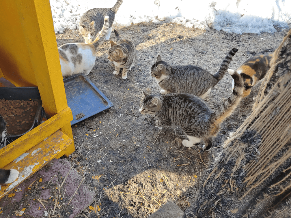 Things started off pretty routine. I did my rounds and the outside cats were very happy to see me. Well. Happy to see fresh kibble and water!