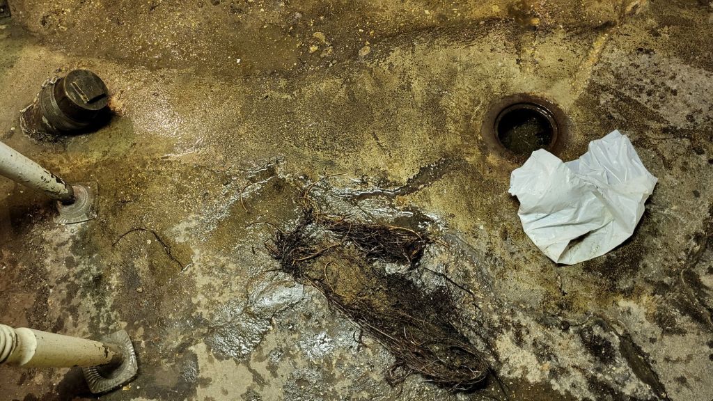 We’ve made a point of clearing those drains fairly regularly, but I guess we had a recent growth spurt of roots coming through! There must be some sort of change in in the pipe between the floor drain and the overflow access, for the sand and roots to build up there, even when it seems like there are almost no roots at all when looking through the openings.