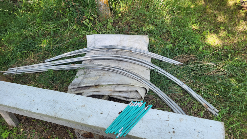 After much fighting, the supports for the car port thingy were put together, slid through the channels in the cover, then dragged over to where it would be set up. What we needed to do next was get the whole thing upright, supported by the lengths of rebar I got to pound into the ground.