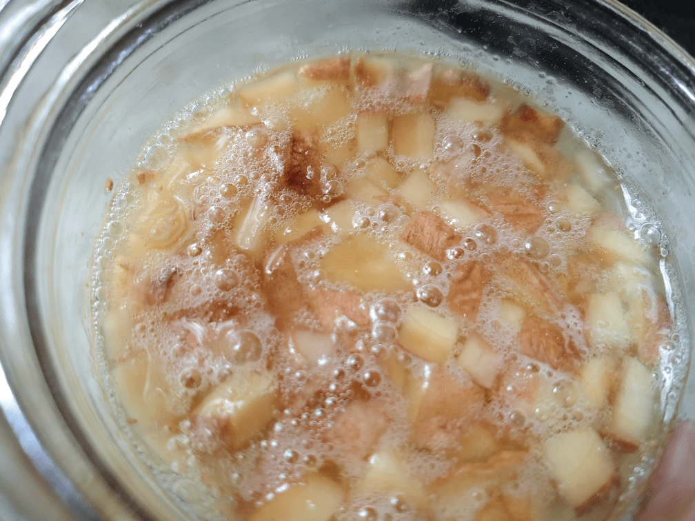 I decided to chop the ginger into a small dice, going with the sites that said it made it easier to strain the liquid out later. I don’t like floaties, if I can avoid them! I left the skin on, because peeling ginger is a pain in the butt.