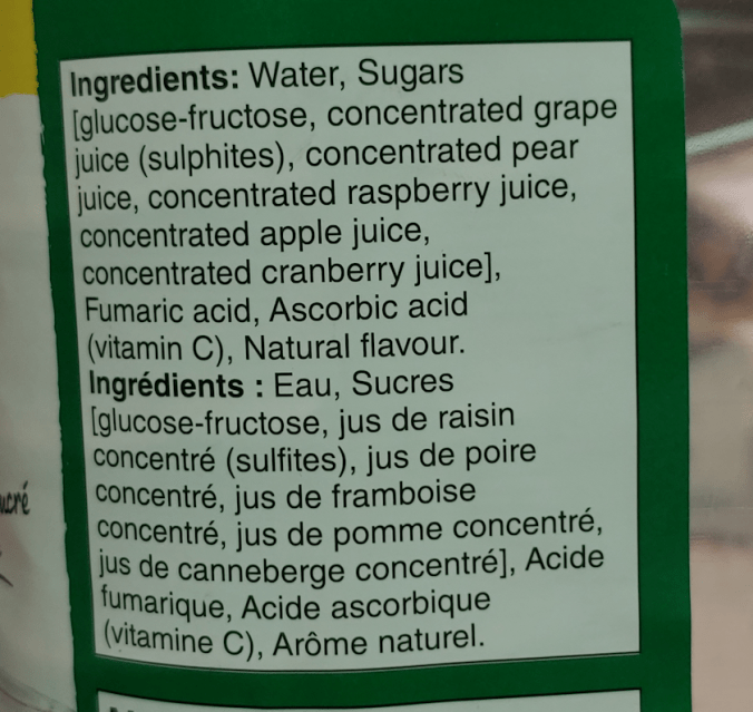 We used a house brand, cranberry raspberry cocktail for the base, which also contained other types of juice in it. The predominant flavour was actually apple.