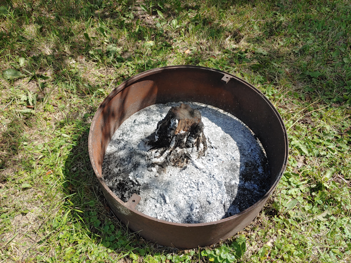 When I stopped for the day, I scrounged for something to cover the stump with. The fire was out, but might still smolder, so I wanted to make sure it couldn’t flare up or spread.