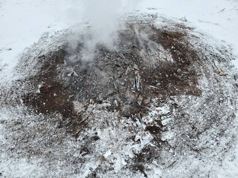 The good thing about doing something like this, this time of year, is that once things burned down enough, I could leave it to smolder. The fire melted enough snow around it to create quite a puddle under it, and there’s nothing but more snow for a substantial distance in all directions.