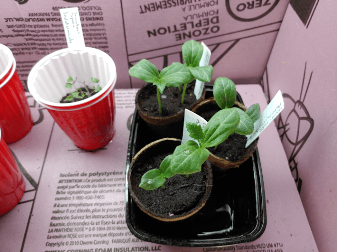 We planted only 2 seeds in each of 3 double cups. We’ll see how many germinate. They went into the small aquarium greenhouse, along with the more recently planted gourds (still no seedlings sprouting there, yet), and the light fixture that’s there to keep the tank warm.