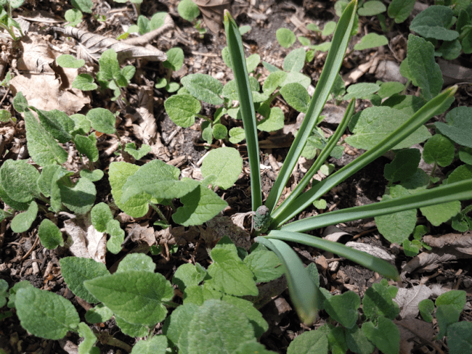The flower spikes in the grape hyacinths are a bit harder to see, but they are certainly there! Pretty much all of them that we can see have these tiny spikes emerging. Once they start blooming, we’ll finally be able to get a better idea of how many of the 200 we planted survived the winter! :-D