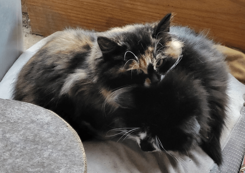 When I first took the cat bed out of the cage and set it next to the one the cats were all crowding into, they ignored it for quite a while. Eventually, though, the cat puddle spilled over, and now they are using it. As I was coming in from my morning rounds, I spotted these two on it and had to take a picture! The black and white has now named Patience. The tortie still needs a name.