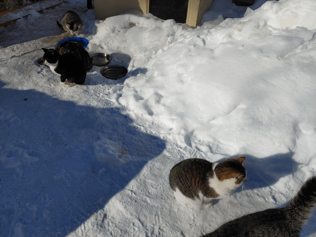 So one of the first things I did after putting food out was shovel around the kibble house, digging out the metal water bowls in the process, and opening up their paths.