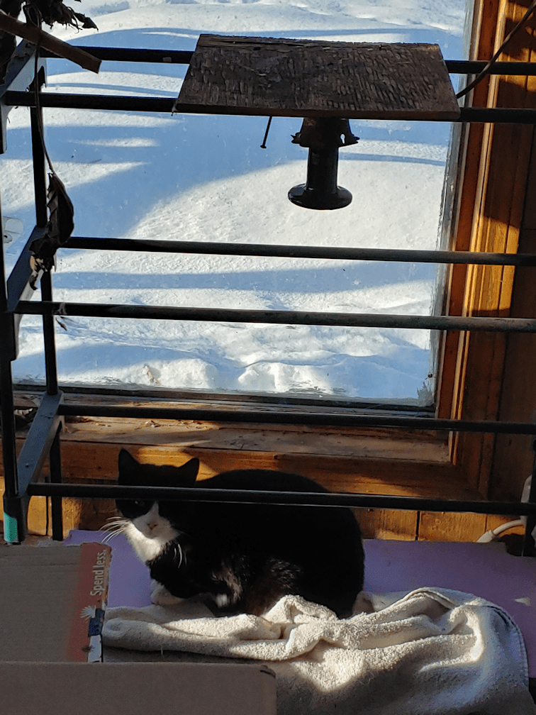 Having brought Beep Beep indoors to have her babies last spring, this will be her first year of NOT getting pregnant. She seems quite content with that! She also seems quite content with her new life as an indoor cat. Even when she went into heat, she showed no desire to go outside to visit the (intact) boys in the yard. We don’t know how old she is, but I have pictures of her from when we made the drive out and stayed here with my dad, back in 2015, and she was definitely an adult cat at the time. That makes her a minimum of 7 years old. I would guess she’s closer to 10, and she would have had a litter of kittens every year of her adult life, until now. She is a wonderful mama, but I’m sure she’s more than done with the babies by now! :-D