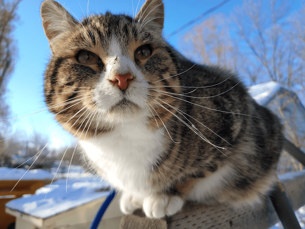 When I head into the sun room to get kibble for the outside cats, it’s not unusual for me to see a cat on the hand rail outside. It’s usually Nosencrantz or Potato Beetle. Sometimes it’s Agnoos or Tuxedo Mask. Not this morning!