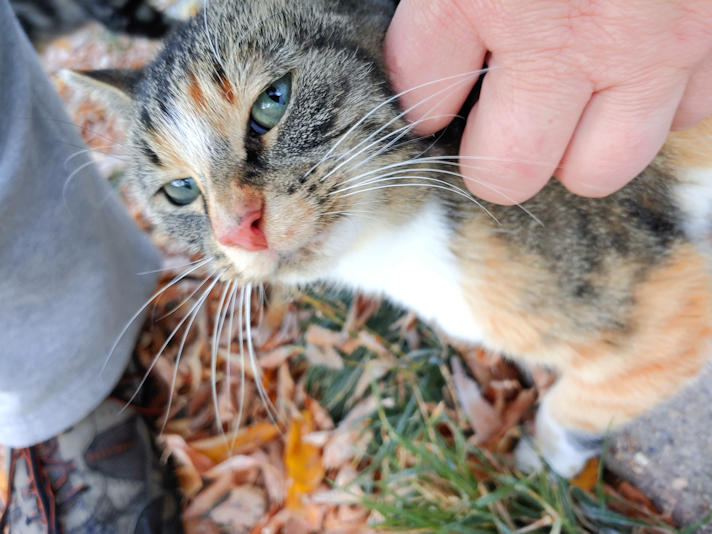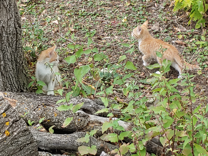 As I was coming back from putting feed out for the deer and birds, I found Creamsicle Jr had shown up in the kibble house. I only got a brief look at his injured eye, and while the fur is still dirty around it, the eye itself is looking almost normal again.