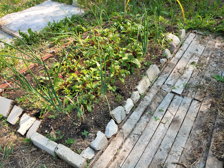 This is the new bed in the old wood pile area, built this spring. It was seeded with Robin beets, a new variety we got along with some Merlin beets, which we tried last year. Later, when we planted onion sets, some were planted around the beets to act as a deer deterrent.