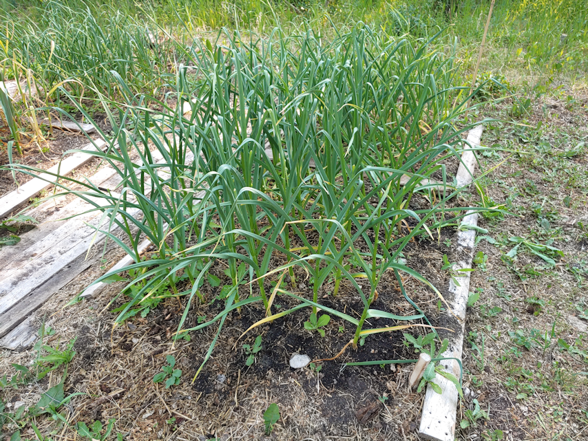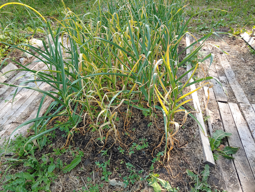The Purple Stripe is looking like they will be ready to harvest soon – but they are still producing scapes! I’m not sure if this is a problem, or if this is normal for the variety!