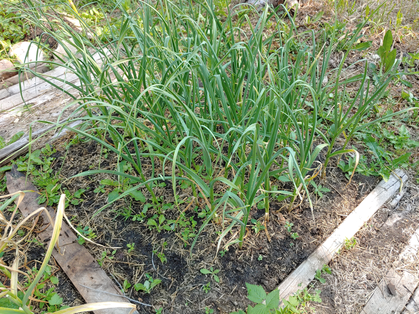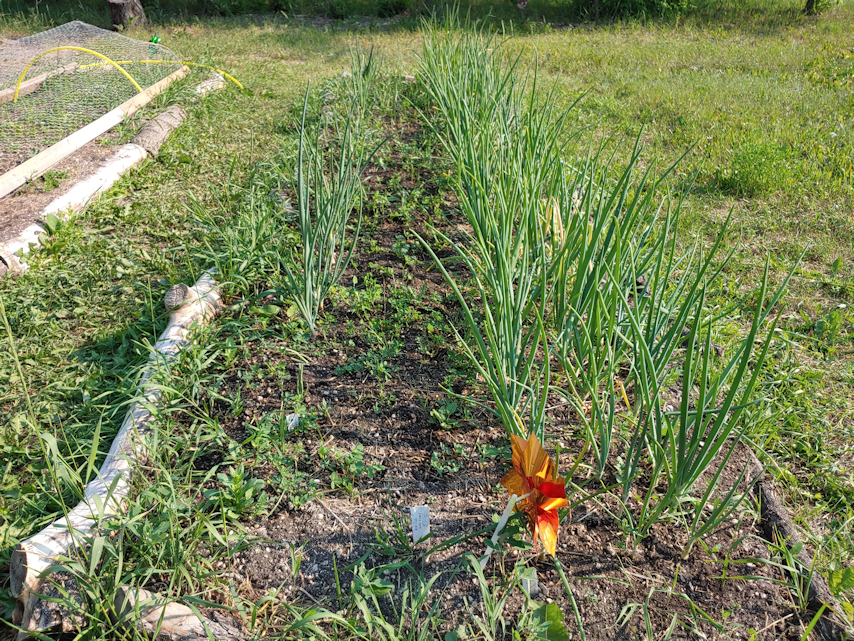 Along two sides of the asparagus bed are some tiny onions. These were some last minute Norstar onions we started indoors after having so many of the other onions seeds we started get destroyed, one way or another. They are incredibly tiny, and yet they are forming bulbs!