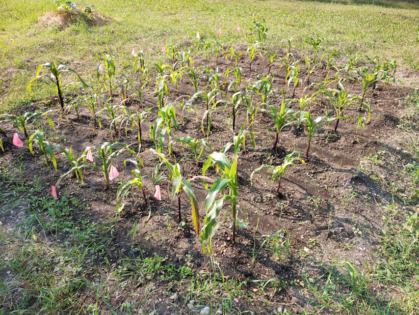 The purple Montana Morado corn (the photo on the left) were started indoors and transplanted, and so far they seem to be a success. A few of them don’t seem to be thriving at all, but most of them look like they are doing just great.