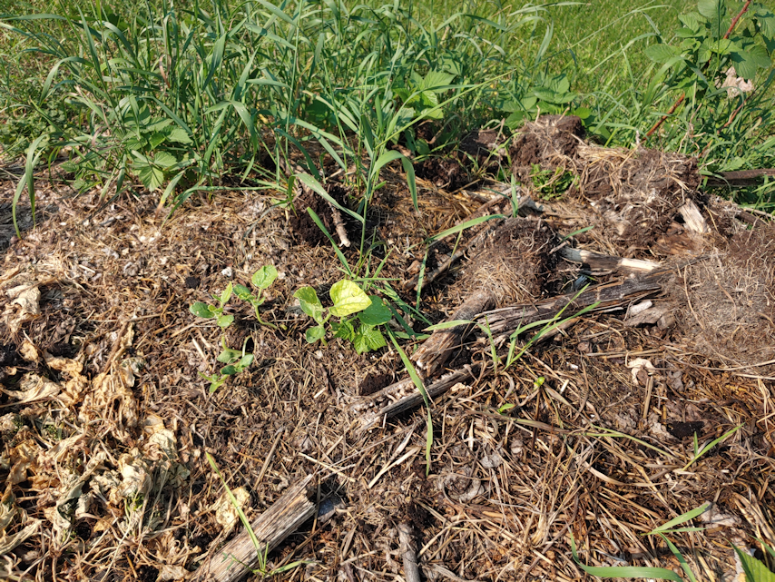 The Dorinny corn were planted before last frost, and you can see the remnants in the photo on the right. Though they are a cold hardy hybrid that would have been able to handle a normal frost, it turned out they couldn’t handle the -8C/18F night we had in late May. The seeds that had germinated before then did look like they survived, but after a few days, they were gone. Thankfully, more germinated later, and of those, they are doing quite well. As long as more don’t get eaten by the deer! The ones that did get nibbled on seem to be recovering, but I doubt we’ll get any corn on those ones.