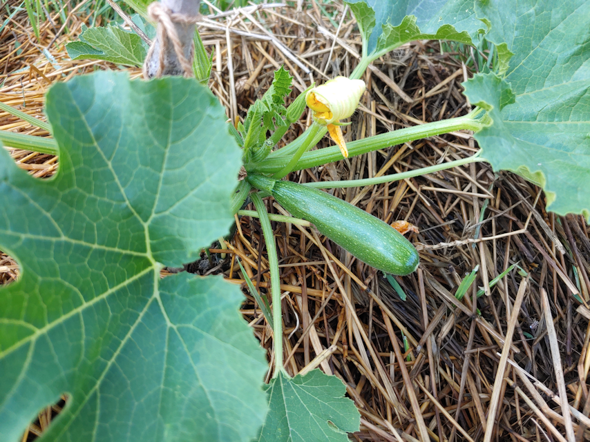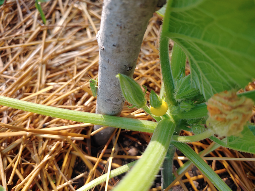 This year, we are trying to grow them vertically, but not all of them are big enough to tie to the stakes yet. But we’ve already got squash forming on those little plants! I am so excited by these! :-D