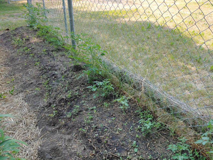 In front of the Spoon tomatoes, you can see tiny wisps of onions. Those are the Red Baron bunching onions, from a very late start with the last of the seeds, indoors. In front of the Mosaic Mix, we have little Norstar bunching onions, again a late planting of the last seeds indoors. Starting these were a bit of a Hail Mary, and I doubt much will come of them, but hwo knows? :-D