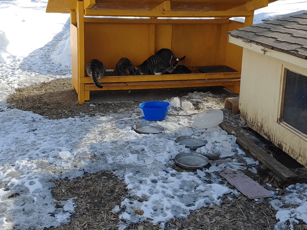 I noticed their water bowls were frozen, and the heated bowl in the sun room was almost empty again. This morning, I looked out the bathroom window and saw one of the ‘iccuses curled up in the empty water bowl, sleeping! I’m glad they can use it to keep warm, but with the outside heated water bowl not working right now, and everything freezing again, I don’t want them to run out of water.