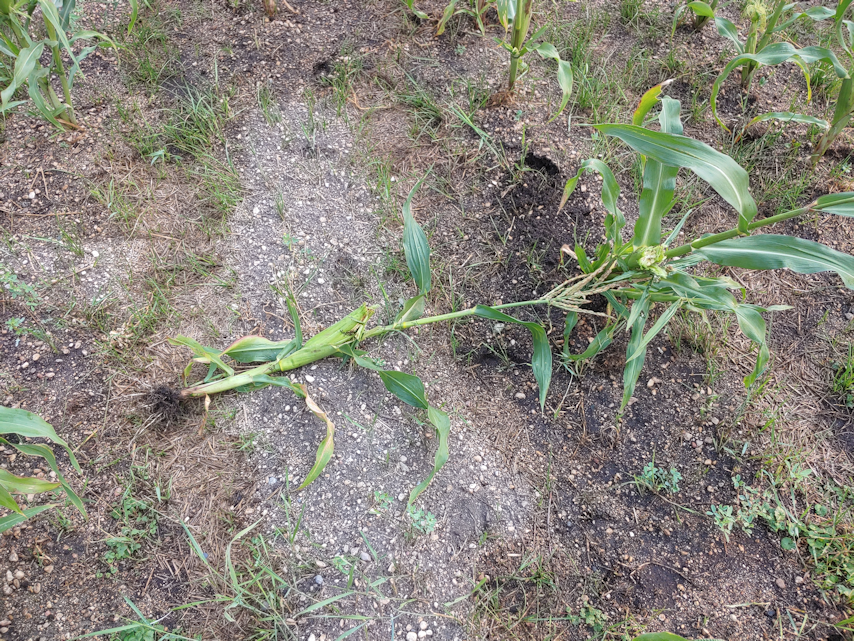 Before heading in, I made sure to water the corn bed, too. There are corn seedlings popping up now! I’m quite happy to see them. I was afraid that, with the heat and minimal rain, they might not make it. Checking the raised box beds in the East yard, I was happy to be able to see more carrot seedlings showing their true leaves, without having to look close and wonder, are those seed leaves carrots, or a weed? It’ll still be a while before the carrots are strong enough that we can safely weed around them. Right now, weeding mostly involves removing the biggest leaves from the weeds, and pulling and dandelion flower buds, and being careful not to disturb any carrot roots.