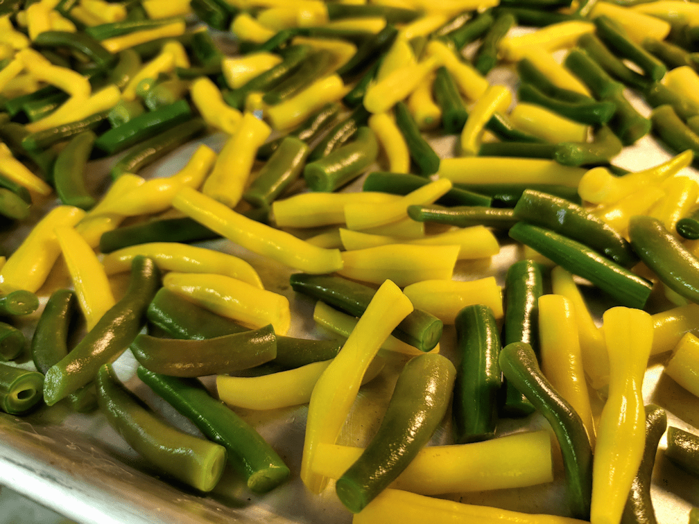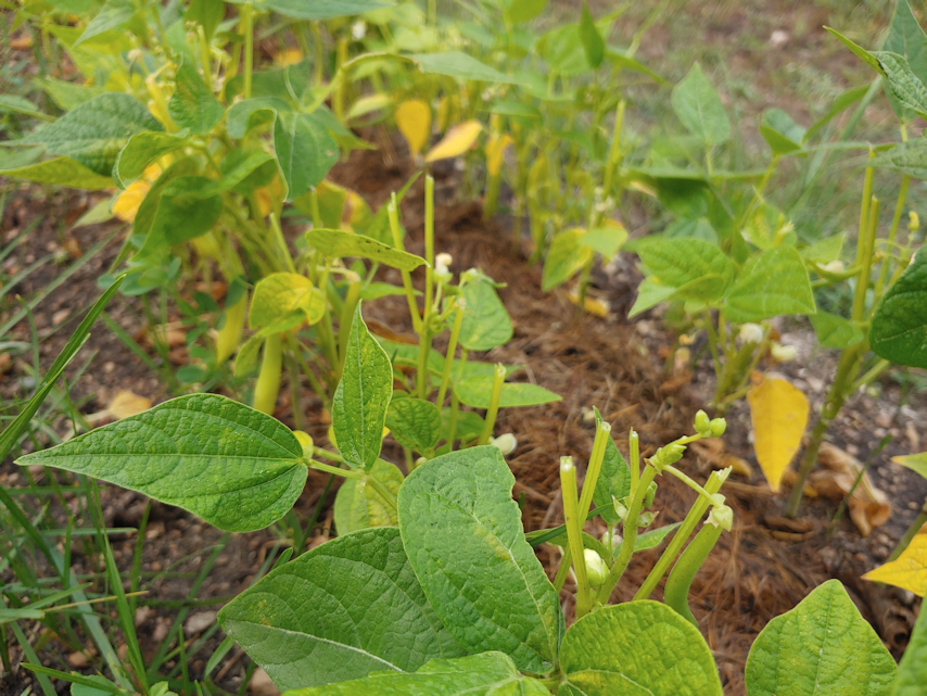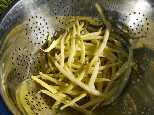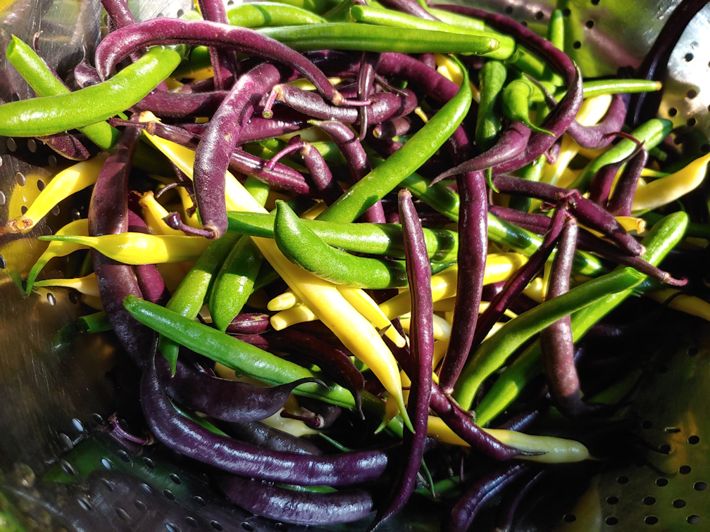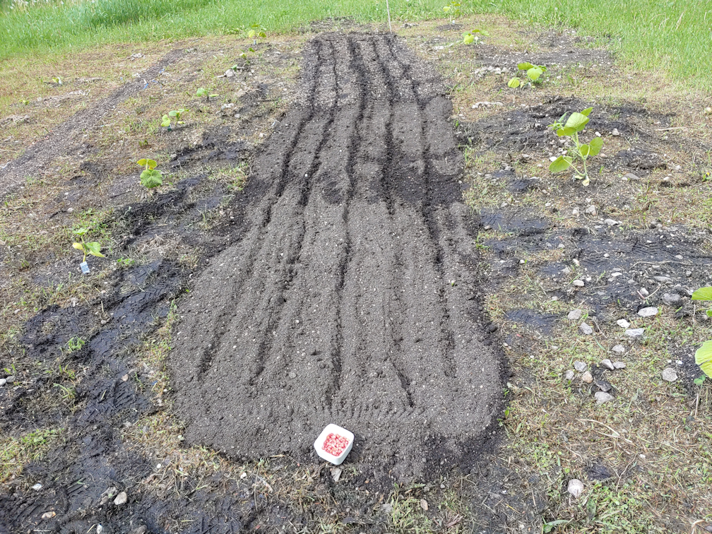 With the high raised bed, I planted the yellow Custard beans – a new variety for us – on the left in the photo, and the green Lewis beans – a variety we’ve grown before – on the right. At each end, I stuck in a few more onion transplants. By this point, only the smallest yellow onion transplants are left, and I was planting them a bit closer to each other than usual, but I was still left with may 10 little transplants left. They’re so small, I probably shouldn’t bother transplanting them, but I’m sure I’ll find someplace to shove them into the ground!